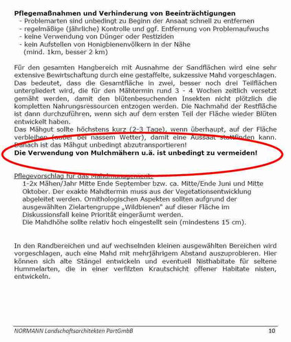 o Die Mahd ist mit einem Balkenmäher durchzuführen. Wir haben aber nur Freischneider gesehen. Auch Laubbläser mit langem Schlauch befanden sich auch auf der Fläche. Diese Geräte sind gerade für Insektenflächen ein absolutes No-Go. (Fotos siehe unten)